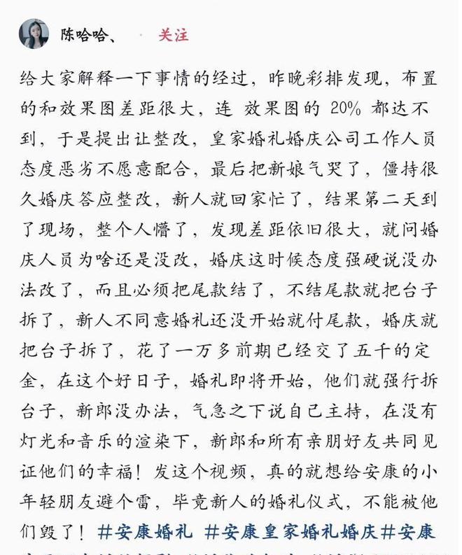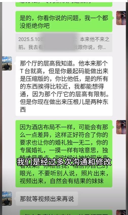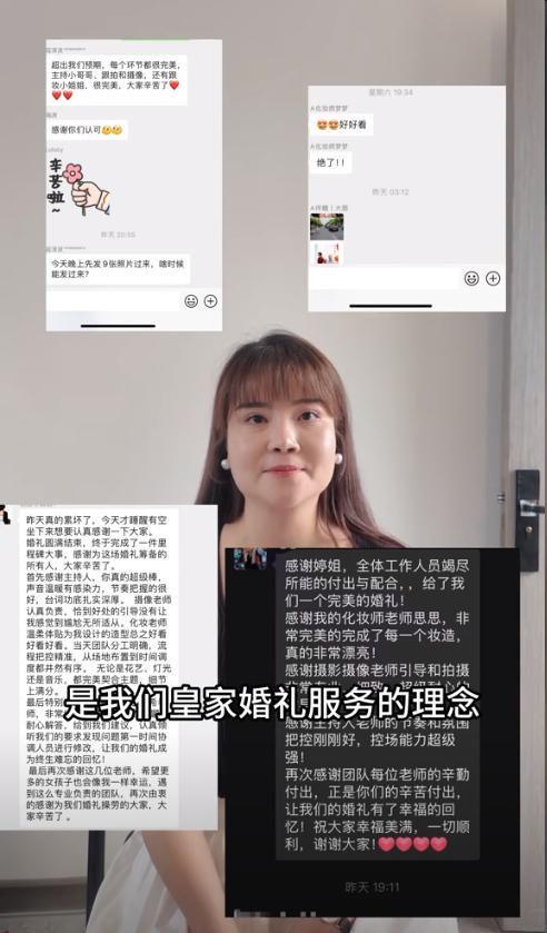 在店主放出员工早上八点便在现场整改的视频,以及婚礼前最后一次彩排时,主持询问新娘是否满意的场景。