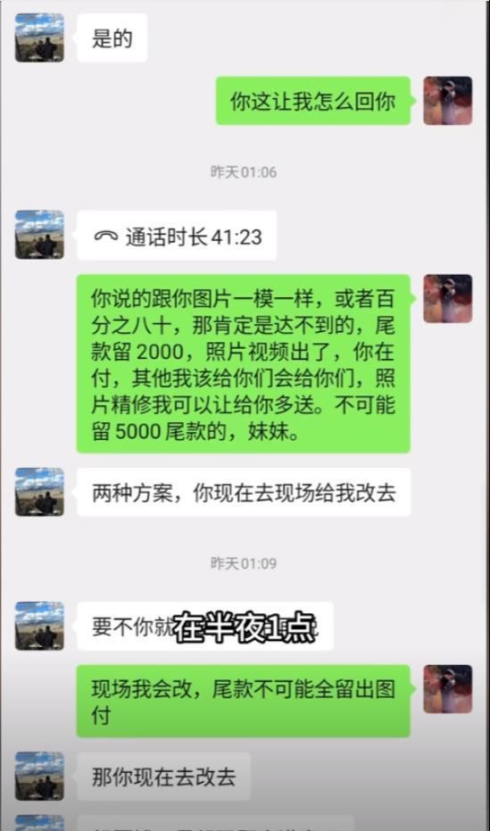 在结束通话员工再次索要尾款,并表示自己会对现场进行整改,可新娘却表示员工想要尾款,最起码要做到自己满意,不少网友都从这句话感受到新娘在用尾款要挟员工。