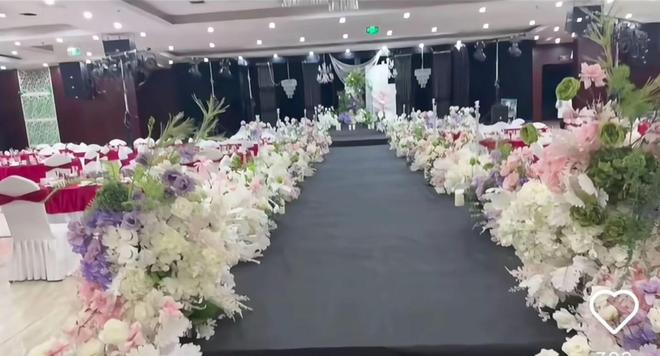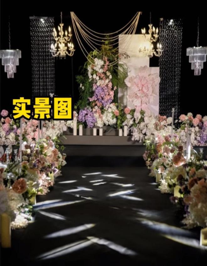 但也有网友翻出婚礼前新人亲友发布的现场图,不知道是不是灯光原因,从这张图上看效果确实一般,背景花墙几乎被绿叶覆盖。