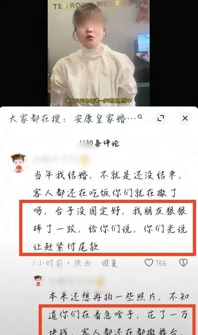 这下网上全是网友对婚庆店以及工作人员的指责,5月11号傍晚,婚庆店主在网上辟谣,她表示自己并没有不经允许随意撤台,网上流传的视频被人掐头去尾,她之后会把详细情况发出来。