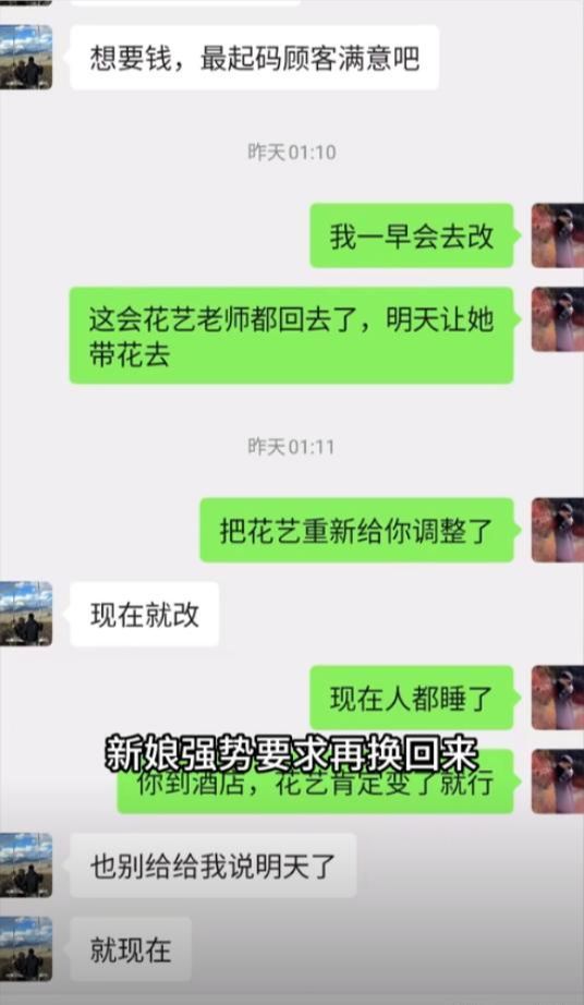 在新娘的坚持下他们照办了,可当员工辛苦完成后,新娘却要求重新改回去,并强势要求员工即刻去酒店整改,可是被员工以太晚为由婉拒了。