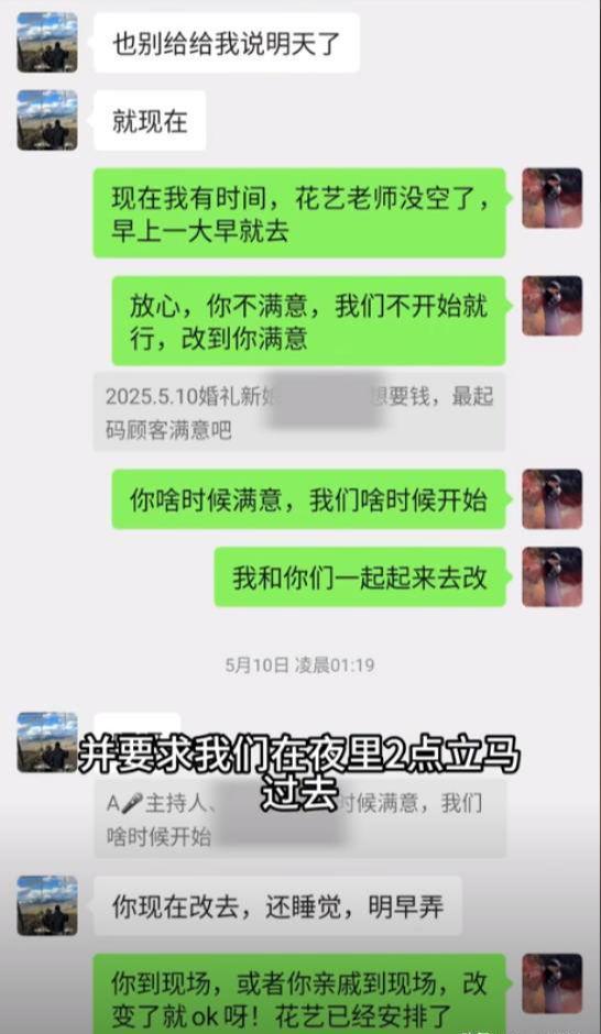 根据聊天记录的时间看,在新娘要求现场整改前,她与员工已经通线分钟,可以推测双方针对整改方案进行争论,而此时已经过了凌晨1点。