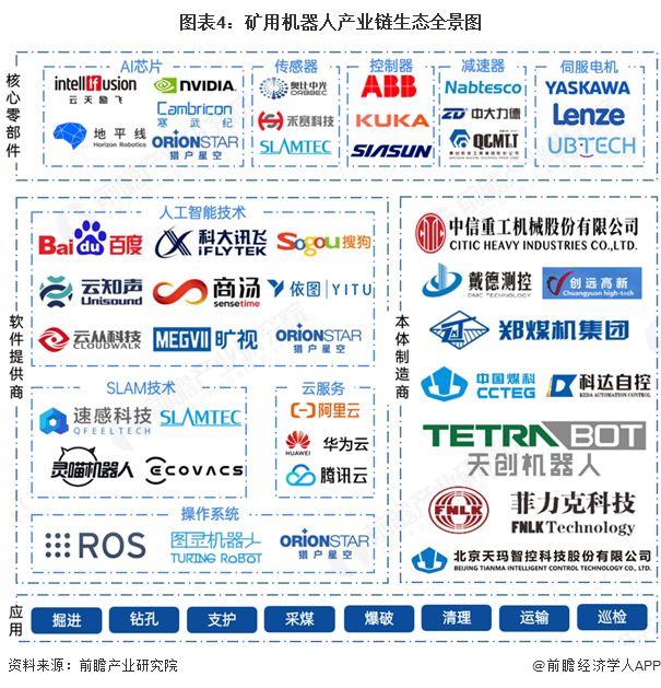 目前,中国矿用机器人行业上游核心零部件大多需要依赖国际机器人厂商巨头提供各类零部件,除了机器人行业“四大家族”把控机器人四大核心零部件外,英伟达、地平线等信息科技公司也占领着大部分AI芯片市场,产业链中游则由包括软件开发商和机器人本体制造商,根据下游客户不同的矿山用途进行制造,包括中信重工、郑煤机、中铁建重工、科达自控、天河科技、山河智能、国兴智能、天创电子、天玛智控等。