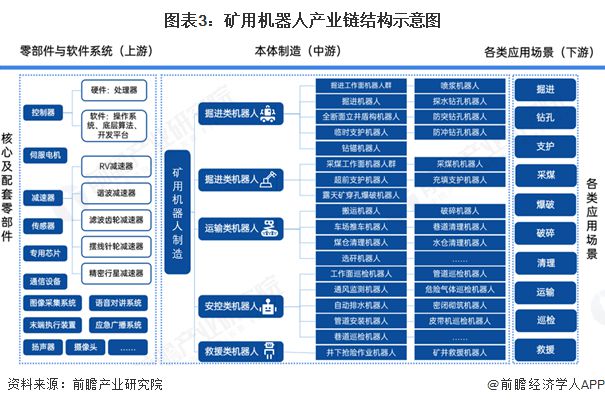 矿用机器人作为特种机器人的一种,其产业链形态与机器人行业的产业链十分类似,上游包括了制造矿用机器人所需要的各类核心、配套零部件以及相关软件系统,产业链中游是矿用机器人本体的制造,下游则是矿用机器人的各类应用,包括掘进、钻孔、支护、采煤、爆破、破碎、清理、运输、巡检和救援。