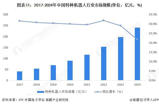 根据《中国机器人产业发展报告》披露,2017-2021年我国特种机器人市场规模呈现连续增长趋势,增长率均超过25%。2021年我国特种机器人行业市场规模折合人民币约为116亿元;2023年特种机器人行业市场规模达到约197亿元,同比增长29%。2024年,特种机器人市场规模同比增长21%,达240亿元。
