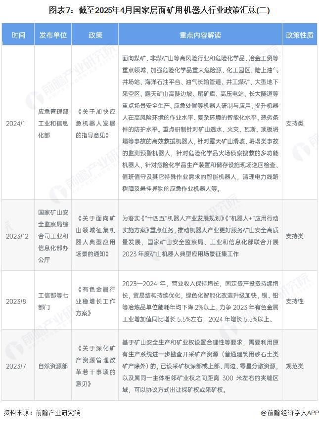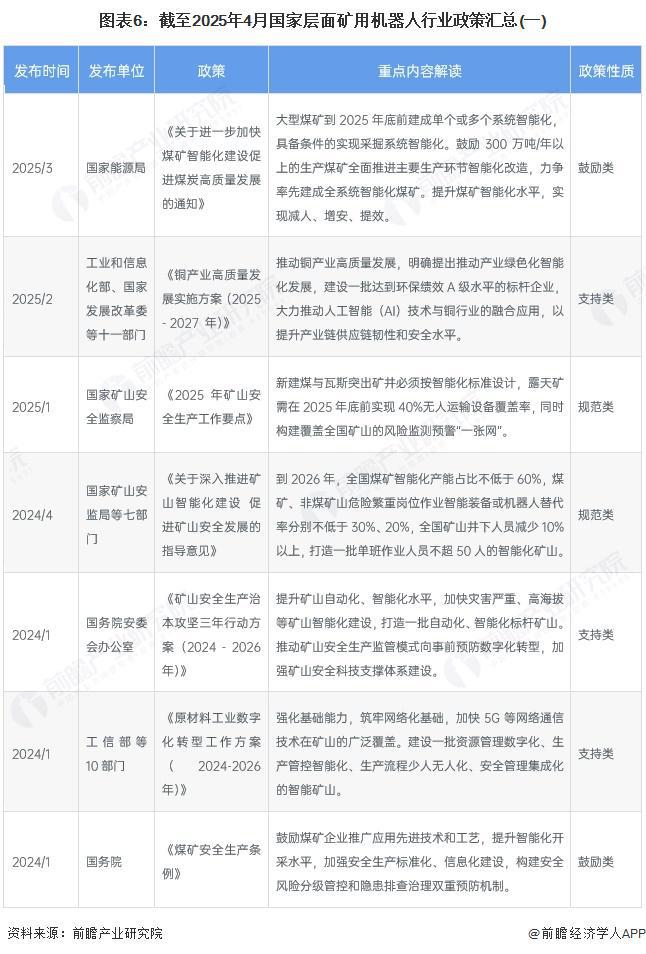 国家高度重视矿山智能机器人的研发应用,助力矿山智能化发展和保障矿山安全、高效生产,保障我国能源安全。2019年1月,原国家煤矿安全监察局(现国家矿山安全监察局)出台煤矿机器人重点研发目录,大力推动煤矿机器人研发应用,推进煤工业高质量发展和安全发展,提出5类38种煤矿机器人。2022年,工业和信息化部发布的《“十四五”机器人产业发展规划》提出推进机器人应用场景开发和产品示范推广。2024年开始,国家层面出台各项政策,鼓励提升矿山智能化建设,大型煤矿进行智能化改造;露天矿需在2025年底前实现40%无人运输设备覆盖率,同时构建覆盖全国矿山的风险监测预警“一张网”。国家层面矿用机器人行业政策汇总如下: