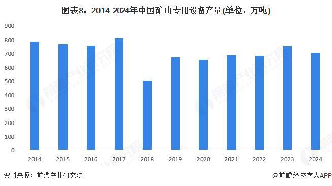 从中国矿山专用设备产量情况来看,2014-2023年中国矿山专用设备产量整体呈现波动水平,自2018年以来整体呈现增长趋势,2023年矿山专用设备产量为753.64万吨。根据《2024年重型机械行业经济运行情况》,2024年矿山专用设备行业营收微增,行业应收账款增长较快,亏损面扩大。在这样的情景下,初步测算2024年矿山专用设备产量有所下滑,产量为705万吨。