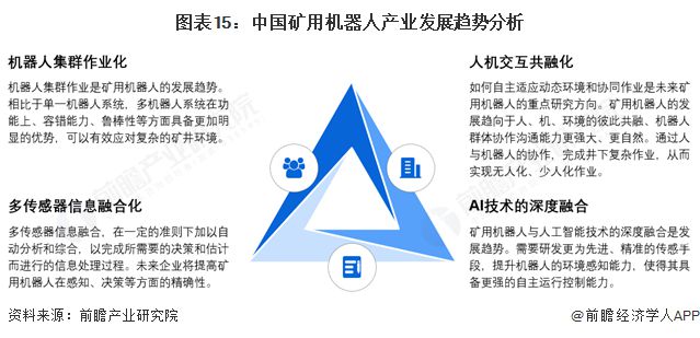 矿用机器人是未来智能矿山的基础支撑和保障设备。近年来,尽管对矿用机器人的研究已经取得了较大的进步,但是距离真正的无人化、智能化的矿用作业还存在一定差距。未来矿用机器人将朝着集群化作业、人机交互工融化、多传感器信息融合化以及和AI技术深度融合的方向发展。