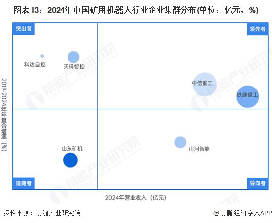 根据2024年营业收入及2019-2024年营收年复合增速进行矿用机器人行业集群的划分,目前行业内有领先者,这些企业在矿业场景上主要的设备还是无人车、自动输送带、掘进机、挖煤机等,这些机械设备也是目前矿井中使用最高的设备,而矿用机器人是起到一个辅助作业,提高大型装备作业效率的作用。目前领先者为铁建重工、中信重工,年复合增速为6-9%,2024年营收分别为80亿元和100亿元。导向导者目前是山河智能,营收处于领先地位,但近年增速发力,五年复合增速仅为-1.5%。突出者是近年来业务增速超过10%的企业,例如天玛智控、科达自控等,这些企业矿用机器人专注度较高,业务增速处于行业领先地位,其中天玛智控营收18.6亿元,市场前景较好。追随者是山东矿机,企业2024年收入同比有所下降,年复合增速较低。